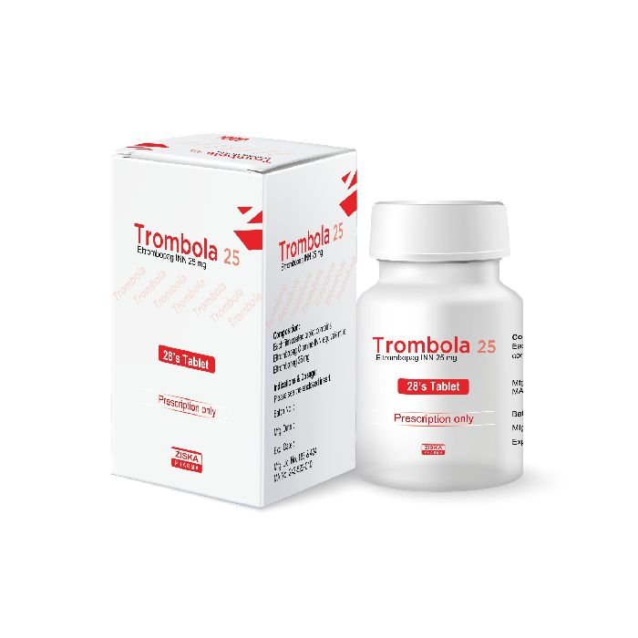 The recommended dosage of Trombola (Eltrombopag) 25 mg may vary depending on the underlying condition being treated, patient characteristics, and individual response to treatment. Typically, the prescribed dose is 25 mg taken orally once daily, with or without food. Treatment duration may vary based on the response to therapy and the discretion of the treating healthcare provider.