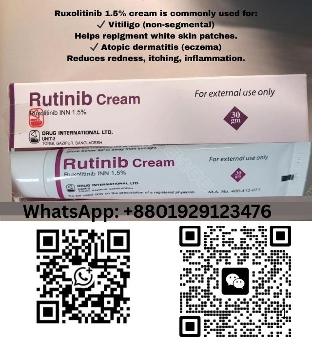 Ruxolitinib 1.5% cream contains ruxolitinib, a Janus kinase (JAK) inhibitor. Unlike general corticosteroids, which broadly suppress immune responses, Ruxolitinib targets specific enzymes (JAK1 and JAK2) responsible for inflammatory signaling. The 1.5% concentration is designed for topical use, ensuring localized effect with minimal systemic absorption.